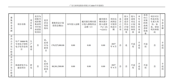 天承科技2024年年报披露,其IPO(首次公开募股)项目中的“年产30000吨专项电子材料电子化学品项目”和“珠海研发中心建设项目”投入进度均为0。