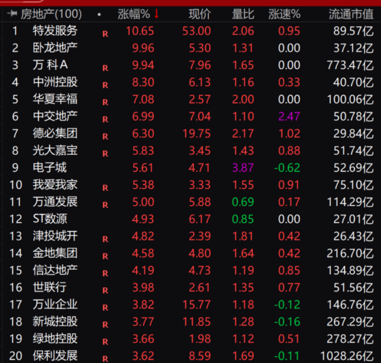 地产股是引领板块。A股地产股尾盘异动,特发服务涨超10%,万科A、卧龙地产涨停,中洲控股涨超8%,华夏幸福涨超7%,中交地产、德必集团涨超6%。港股内房股异动拉升,万科企业、融创中国涨超15%,世茂集团、新城发展、旭辉控股集团、富力地产、龙湖集团均涨超6%。